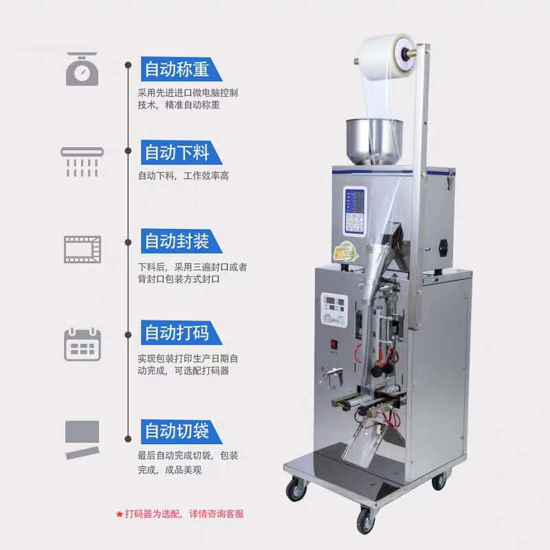 包裝機采用國內(nèi)先進高智能微電腦控制技術(shù),是我司新款研發(fā)生產(chǎn)的小型全自動包裝機械設(shè)備,包裝美觀,精度高速度快。適合食品、醫(yī)藥、化工產(chǎn)品中的松散、無粘性細小顆粒狀、物料的自動包裝,如干燥劑、味精、洗衣粉、茶葉、白糖、食鹽、種子、咖啡、飲料、沖劑、麥片等。
